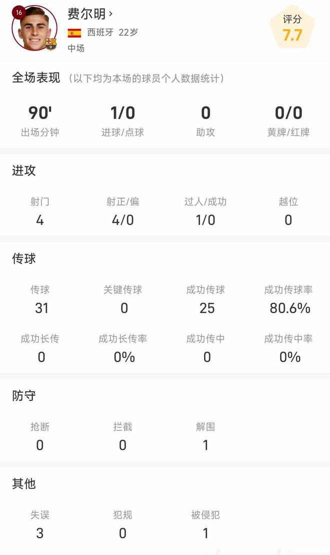 费尔明数据:4次射门全部打正,打入巴萨唯一进球